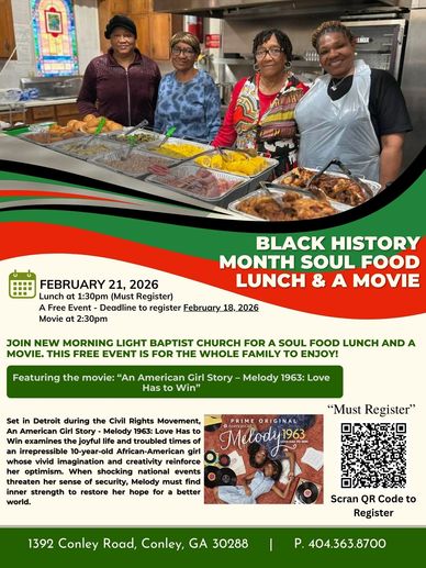 Black History Month Soul Food Lunch & A Movie. February 21, 2026. Lunch starts at 1:30 pm and the Movie starts at 2:30 pm. This is a free event however, you must register. Deadline to register: February 18, 2026. Scan QR Code to register. or click on link: https://forms.gle/E9dEBLBsRz4BD46fA