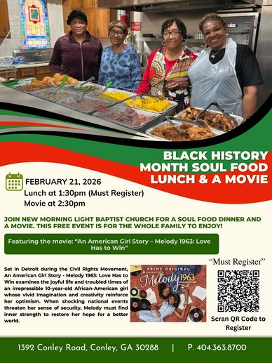 Black History Month Soul Food Lunch & A Movie. February 21, 2026. Lunch starts at 1:30 pm and the Movie starts at 2:30 pm. This is free however, you must register. Scan QR Code to register.